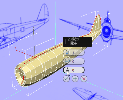 “循环”面板上,按住 Shift 键单击 此时 3ds Max 将显示“连接”工具 caddy。在 caddy 上,请务必将“滑块”(第三个控件)设为 0,以便将新的边集完全居中,然后单击