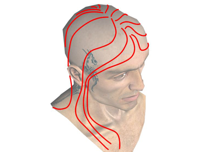 - 在头部左侧绘制第一根从头顶往下延伸至右肩的样条线。右键单击结束样条线的创建。