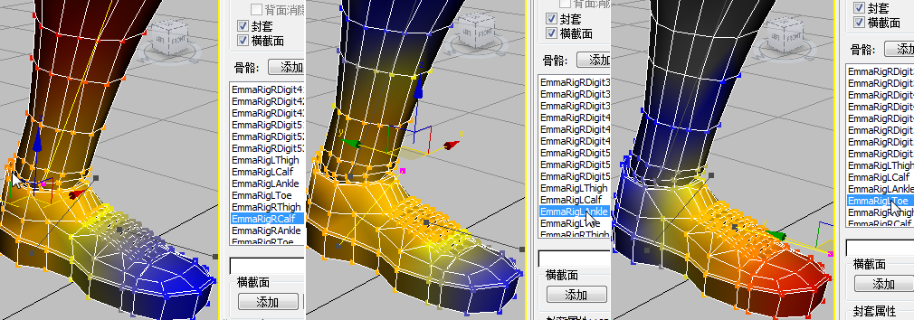 从左到右:小腿、脚踝和脚趾的骨骼都已选中。