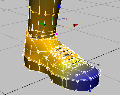 由于“背面消隐顶点”复选框已取消选中,这同时也会选中您对面的大多数顶点。根据视角和您所拖动的区域,可能有一些顶点没有选中。为确保选中所有的脚部和脚踝顶点,