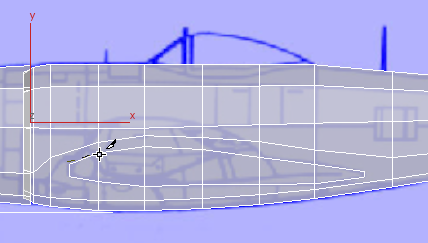 在“前”视口中,使用“剪切”工具在机翼轮廓周围创建边。可使用某一蓝图图像帮助找到这些剪切边,但对于机翼的前部分,请使用其上方的轮廊和以下图示。