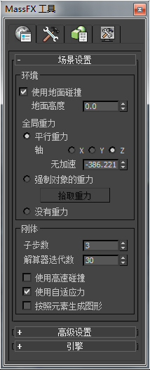 3ds Max 将打开“MassFX 工具”对话框并定位到“世界参数”面板。