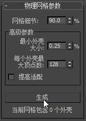 3ds Max 将需要一些时间进行计算。在此期间,系统将显示状态消息“正在计算”,并以百分比形式显示计算进度。当完成物理图形后,状态行将显示新合成网格的相关信息:“当前网格包含 14 个外壳”。但是,您可以在视口中看到新的物理图形仍为凸面。