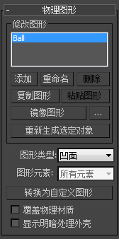 模拟中对象的属性由“MassFX 刚体”修改器提供。简单的静态对象可以由几何(原始)网格来表示;动态对象可以由物理图形来表示,根据原始几何体,物理图形可以采用多种不同的形式。若要模拟凹面对象,请选择“合成”物理图形类型,然后单击“生成”构造一组近似于凹面对象的凸面外壳。