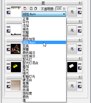 “线性 Burn”会将顶层中的像素颜色与基本层中的颜色结合在一起。“第五层”的颜色越暗,效果越显著:因此,默认混合太暗。
