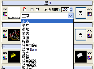 这些选项与诸如 PhotoShop 和 Combustion 之类的绘制程序提供的选项类似。有关每个混合选项的作用的描述,请参见合成贴图。
