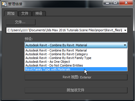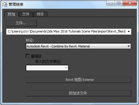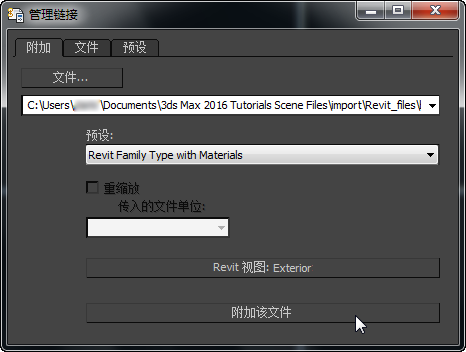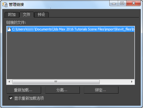 已链接到 3ds Max 场景。在 Revit 中执行完场景的更改后,您还会用到此选项卡;但此时您已完成“文件链接管理器”的部分。