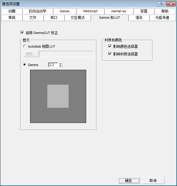 - 3ds Max 将打开“首选项”对话框,并打开其中的“Gamma 和 LUT”选项卡。打开“启用 Gamma/LUT 校正”。确保已选择 Gamma,并且 Gamma 值已设为 2.2。
