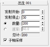 在“粒子视图”的右侧,3ds Max 将为“出生”操作符显示一个参数卷展栏。如以下字段所示,“Birth”操作符总共生成 200 个粒子。它从第 0 帧开始发射粒子,并在第 30 帧停止发射粒子。