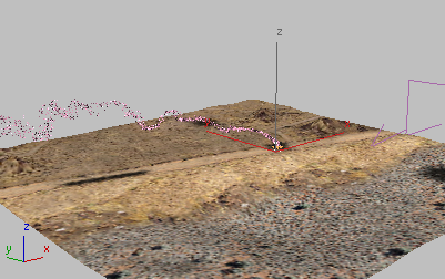 “风”空间扭曲图标是一个带有向外指出的箭头的正方形。在明暗处理视口中,此正方形隐藏在地形之后,但是在“透视”视口中,您可以更轻松地看到箭头。