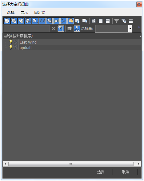- 单击然后在按住 Ctrl 键的同时单击以高亮显示“East Wind”和“Updraft”空间扭曲,然后单击“选择”。