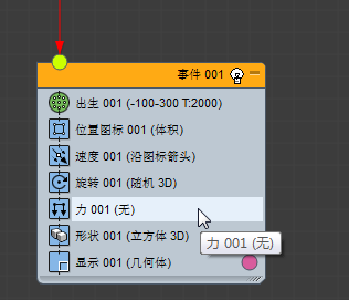 - 在“粒子视图”左下方的“仓库”中,单击以高亮显示“Force”操作符,然后将其拖至事件显示,并恰好放置在 Event 01 上的“Shape”操作符上方。
