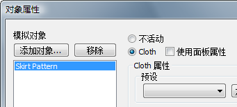 “模拟中的对象”列表中,单击 Skirt Pattern 以高亮显示它,然后选择“布料”。