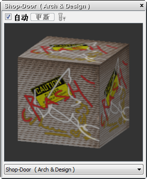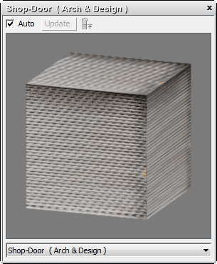 第一个示例窗中包含名为 Shop-Door 的 Arch & Design 材质。已将此材质应用于汇总快门对象 (door-sec)。