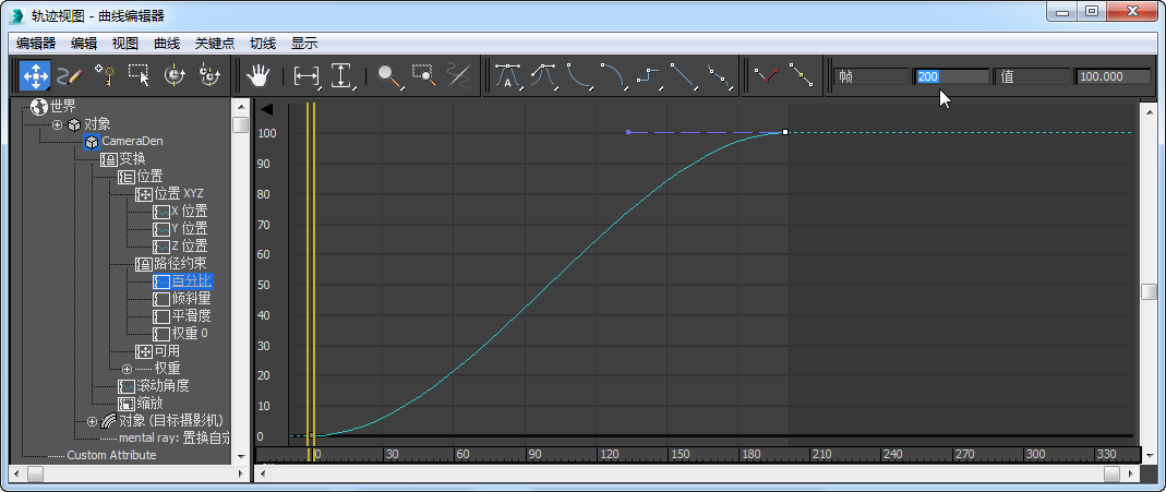 “关键点输入: 轨迹视图”。 现在动画持续时间为 200 帧,并且现在曲线已到窗口的最右边。