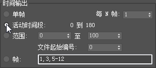 - 在“时间输出”组中,选择“活动时间段”。(如果保留设置为“单帧”,则将仅渲染当前显示的帧。)