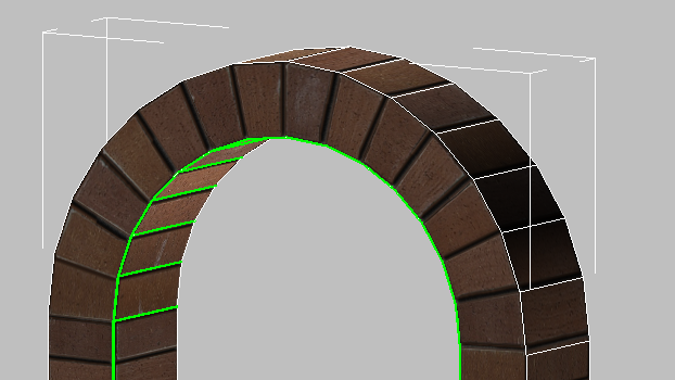 由于已水平拉伸 UVW 导向,以覆盖三个贴图平铺(沿 U 轴方向,0 到 3 平铺),因此现在已沿着拱门长度方向对砖进行了三次贴图。