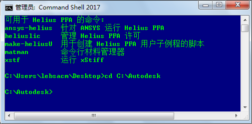 - 打开 Helius PFA 2018 Command Shell,方法是单击桌面图标(或“开始”>“Autodesk”>“Autodesk Helius PFA 2018”>“Command Shell 2018”)。