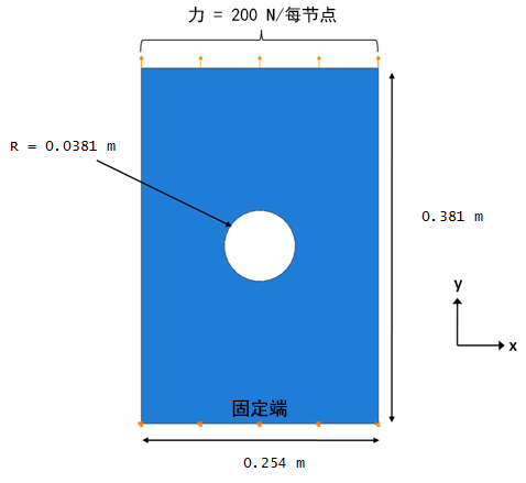 问题如下:平面复合板中心处有一个孔,该板一端受固定边界条件约束,而另一端受拉伸载荷约束。该板由单向材料制成。铺层为 [0/±45/90]s,层厚度为 0.000127 m,这导致板厚度为 0.001016 m。载荷比 Smin/Smax 为 0.1,载荷频率为 10 Hz。网格的种子大小是 0.005,并使用了带缩减积分的八节点等参块体单元。标注、边界条件和载荷如下所示。