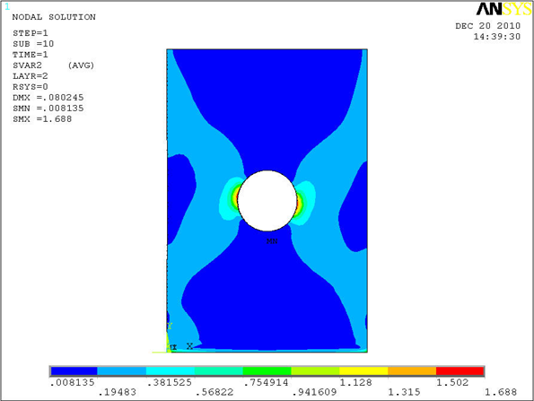 请注意,在层 1 中 SVAR2 的最大值为 0.83,这由于边界条件而发生在底部表面。忽略边界条件应力集中,SVAR2 的最大值约为 0.55,并出现在缺口应力集中处。由于缺口附近 SVAR2 的最大值小于 1,因此无法预测基体失效是否出现在层 1 中。