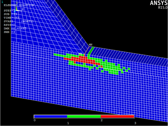 有一些求解变量可用于查看粘性材料的结果。特别是用于确定损坏萌生的失效索引 SVAR2 和指示何时会发生刚度完全丢失的损坏变量 SVAR6。若要检查粘性求解变量,最好在视口()中仅显示粘性单元。有关分析中所使用的求解变量的完整列表,请参见 .mct 文件。