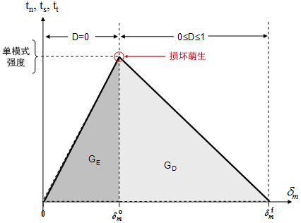 损坏演变模型必须能够准确地表示损坏变量 D 从初始值 0 到最终值 1 的演变,不管是否准确地记录了粘性材料承受的组合载荷。请注意,可以开发依据应变(例如,相对位移)或应力表示的损坏演变模型,如果没有初始实现,我们将采取基于应变(相对位移)的方法。可以假设损坏演变会受到法线和剪切相对位移不同程度的影响,因为这种假设有合理性又直观。但是,为了简单起见,我们假设损坏演变可以表示为单独标量测量相对位移的函数(称为有效相对位移
