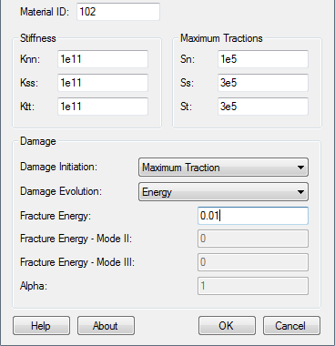 - “软化类型”选项定义了用于计算失效萌生后单元刚度降低的方法。选项包括“位移”、“能量”和“混合模式能量”。