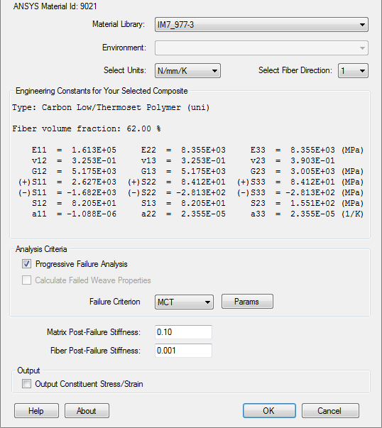 - 从材料库列表中,选择“IM7_977-3”。记下 ANSYS 材料 ID,即 9021。我们将在以后为复合层指定材料时需要此编号。