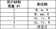 Helius PFA 用户定义的材料子例程将要使用的单位制由紧跟 *USER MATERIAL 语句之后的数据行上的第 1 个用户材料常数定义。下表显示了第一个用户材料常数的整数取值范围,并列出了每个值指定的单位制。