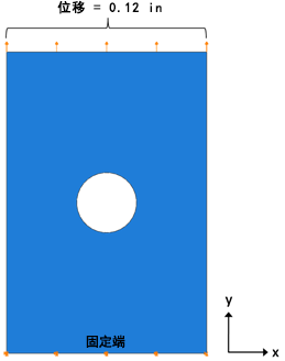 随着施加的位移从0.084 增加到约 0.096,复合板的全局刚度将大幅缩减,(如载荷-位移图中所示)表明本地化的纤维成分失效出现非常明显的层叠(即主要失效事件已发生)。通过检查等值线图,我们会发现:施加了 0.096 位移时,复合板沿圆形孔的垂直边缘已有大量的纤维成分失效。随着施加的位移增加超过 0.096,复合板不再以越来越大的结构力来应对越来越大的位移。相反,复合板中的整体结构力保持相对恒定,表明本地化的失效扩散太快而无法生成任何其他结构力。但是,如以上图中的两条虚线所示,尽管实际上整体结构力保持相对恒定,但复合板的总体割线刚度持续降低。