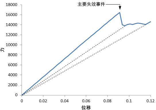 从施加 0.0912 位移开始,结构的总体割线刚度开始迅速下降。在此点之外,因为施加的轴向位移会进一步增加,该结构无法借助其他结构力进行抵制。