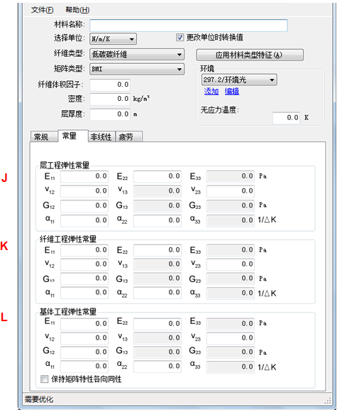 Helius PFA 将纤维成分特性视为横向各向同性。如果这些成分特性未知,Autodesk 提供了默认成分特性,这些特性可通过以下方式输入:在纤维类型下拉菜单下选择某一纤维,然后单击“应用材料类型特性”。纤维类型为将在以下情况下修改的成分特性提供了一个起始点:当 mdata 文件已保存以关联指定的层特性时。当前,默认特性仅为碳、玻璃和克维拉纤维提供。如果您具有其他材料系统,请与 Autodesk 联系以完成材料特征化。如果需要热分析,则必须输入热膨胀系数。如果复合材料热膨胀系数保留为零,则纤维热膨胀也必须设为零。附录 A 中提供了关于默认材料特性由来的说明。