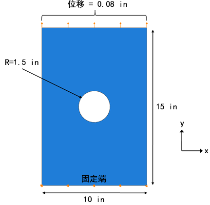 问题在于平面复合板的中心具有一个孔。以一端是固定的边界条件,而另一端是 0.08"(板长度的 0.53%)的位移控制载荷为条件。板的材料为 IM7/8552;铺层为 [0/±45/90]s,并且材料层厚度为 0.005",从而导致板厚度为 0.04"。网格种子大小为 0.2,使用缩减积分连续壳单元 (SC8R)。标注、边界条件和载荷如下所示。在创建了模型并完成有限元分析之后,提供用于查看和解释结果的步骤。