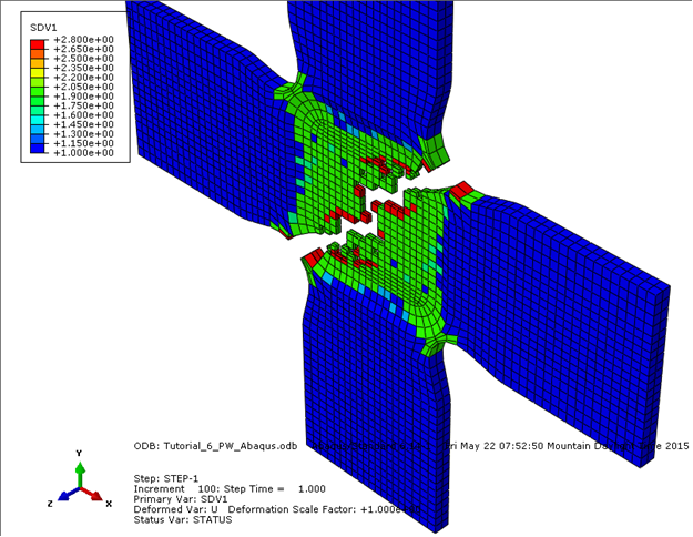 现在,正如我们对大型槽口样本所执行的操作,我们将检查 SDV1 来评估十字形结构中出现的损坏。我们还可以查看在失效传播时如何从我们的模型中删除单元。