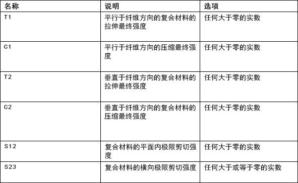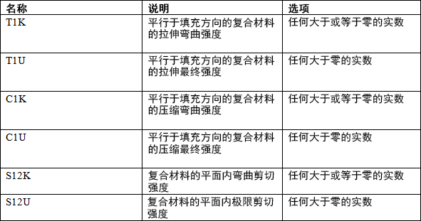 *STRENGTHS 是 *ENVIRONMENT 的子关键字。对于单向复合材料,*STRENGTHS 关键字数据为: