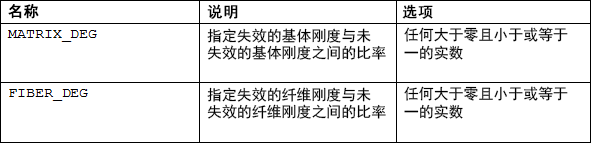 *DEGRADATION 是 *MATERIAL 的子关键字,对于平织材料,必须存在此关键字。此关键字提供基体和纤维成分的失效刚度与原始刚度之比。