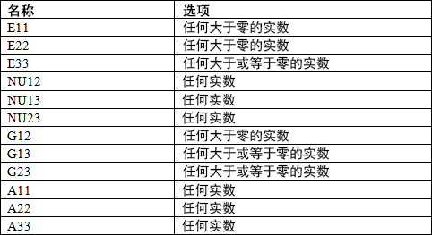 *LAMINA 是 *ENVIRONMENT 的子关键字,是必需项。此关键字提供层的目标弹性常量。对于单向复合材料,关于 2-3 平面的材料假定为横向各向同性。单向复合材料的 *LAMINA 数据为: