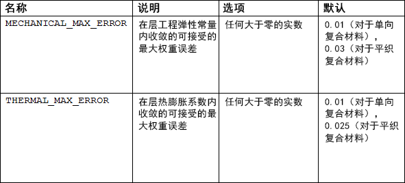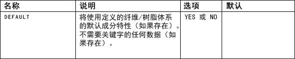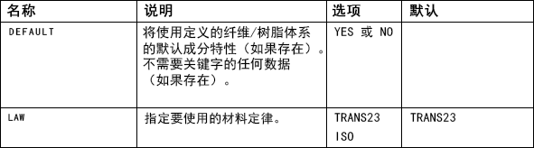 对于平织复合材料,材料假定为正交各向异性。如果所有材料特性均为已知,则进行提供。否则,以下特性可以作为零提供,并且将由 CMM 计算:E33、NU13、NU23、G13、G23 和 A33。平织复合材料的 *LAMINA 数据为: