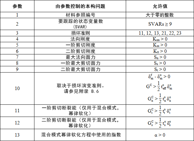 Helius PFA 用户定义的材料子例程将使用这些参数来确定应当用于粘性材料的多量程本构关系的精确形式。对于任何类型的 Helius PFA 粘性材料,参数的数量必须都在 10 到 13 的范围内。下表简要描述了每个可能的参数控制的功能以及每个参数的允许值范围。