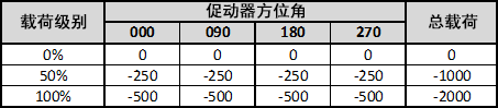 四个促动器用于将集中式垂直压缩力应用于位于圆锥结构(上方)之上的载荷压头。下表列出了应用于载荷压头上四个位置的压缩力。这些力会产生均匀垂直压缩载荷,其中 100% 载荷对应于总垂直压缩力 200,000 lbs。