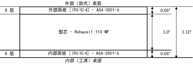 复合圆锥结构以夹层面板构造为特征。夹层面板(下方)的厚度层轮廓在圆锥上的环绕方向和轴向上都是均匀的。夹层构造的内部和外部合成面片具有 [(90/0)4] 铺层,该铺层从内表面(轴向为 0°,环绕方向为 90°)进行测量。每个复合层的厚度为 0.0075",并且由碳/环氧树脂 AS4-3501-6 组成。1" 厚型芯是各向同性泡沫材料 (Rohacell 110 WF)。
