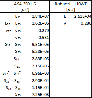 AS4-3501-6 和 Rohacell 110 WF 的材料特性在下方提供。失效后刚度比 0.1 用于基体失效,0.01 用于纤维失效。