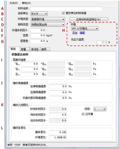 在您选择创建新的编织材料文件后,“非线性”选项卡将仍处于活动状态。但是,任何在“非线性”选项卡上输入的数据将被忽略,原因是编织物不支持失效前非线性功能。