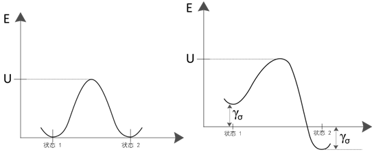 其中 h 是普朗克常数 (h = 6.626068 × 10-34 J-s/K-atom),kT 是波耳兹曼常数 k (k = 1.3806504 × 10-23 J/K-atom) 和绝对温度 T 的乘积所表示的热能。但是由于与每次振荡关联的热能实际上不是单个数,而是一个分布,因此始终存在以下可能性:任何给定的振荡有足够的能量来克服能量障碍 U,并从一种平衡状态移到另一种平衡状态。任何给定振荡发生此情况的可能性由熟悉的指数形式
