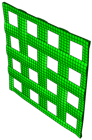 缎纹编织材料的完整单位单元 (FUC) 微观结构类似于平织模型,因为它由填充牵引、扭曲牵引和基体腔组成。FUC 还假设填充和扭曲牵引互相垂直。和平织微观结构一样,定义 FUC 微观结构也需要许多几何特性(长度、宽度、高度、间距)。
