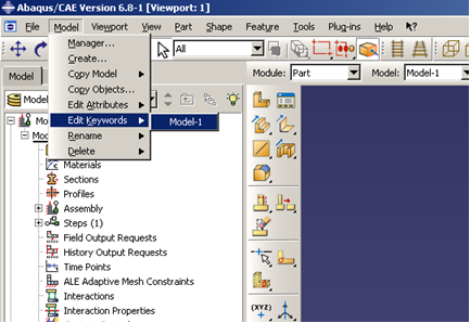 若要在 Abaqus/CAE 中访问模型关键字,请依次选择,然后选择“模型名称”,如下所示。