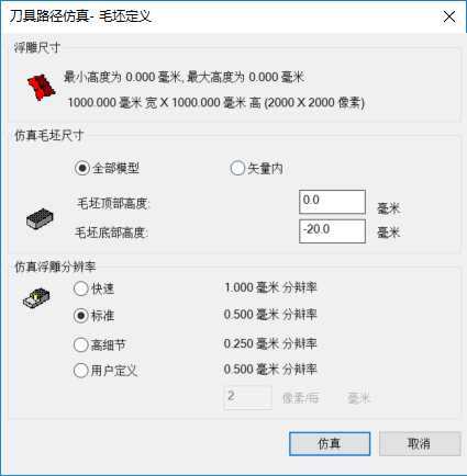 按钮。 将显示刀具路径仿真- 毛坯定义对话框,例如: