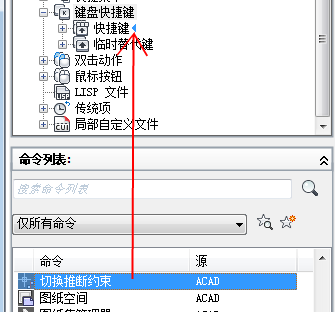 - 要创建快捷键,请在“命令列表”窗格中,将命令拖至“<文件名> 中的自定义设置”窗格的“快捷键”节点。