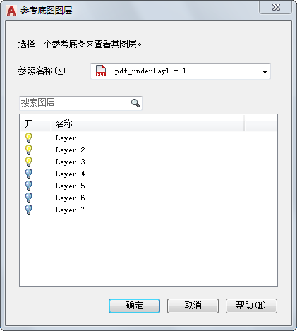 使用 DWFLAYERS、PDFLAYERS、DGNLAYERS 或 ULAYERS 命令,或在选定的参考底图上单击鼠标右键,然后单击快捷菜单中的“图层”。
