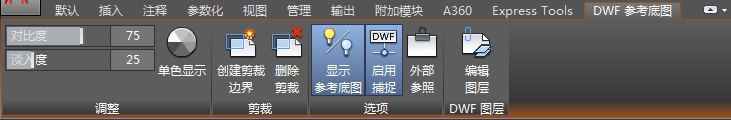 选择图形中的 DGN 参考底图时,“DGN 参考底图”上下文选项卡将显示在功能区上。